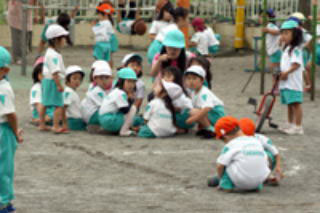丸十鬼がはじまりましたよ。でもあれれ?丸の中に年少さんがきてお砂遊びをはじめたようです。ぶつかったら危ないかな?