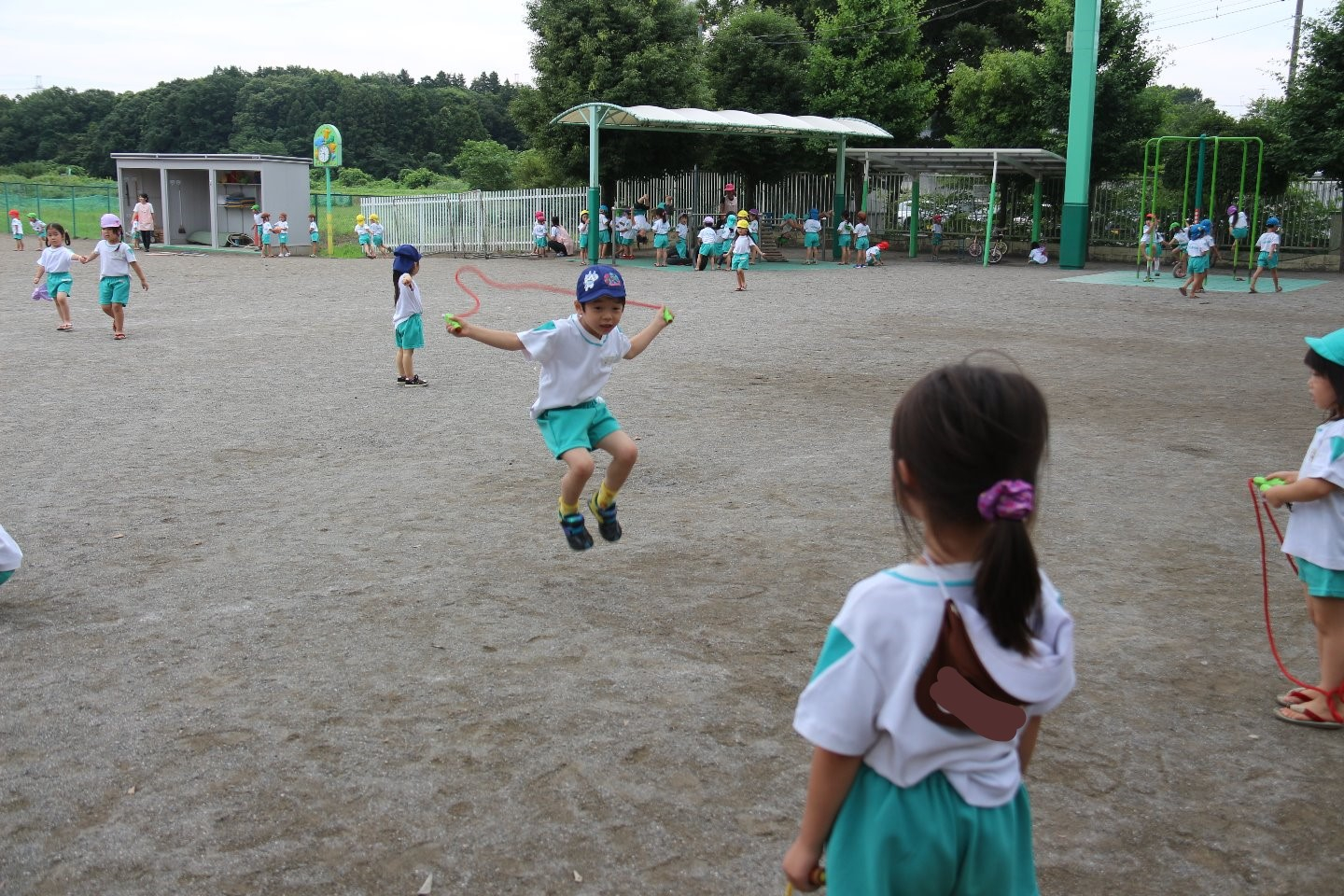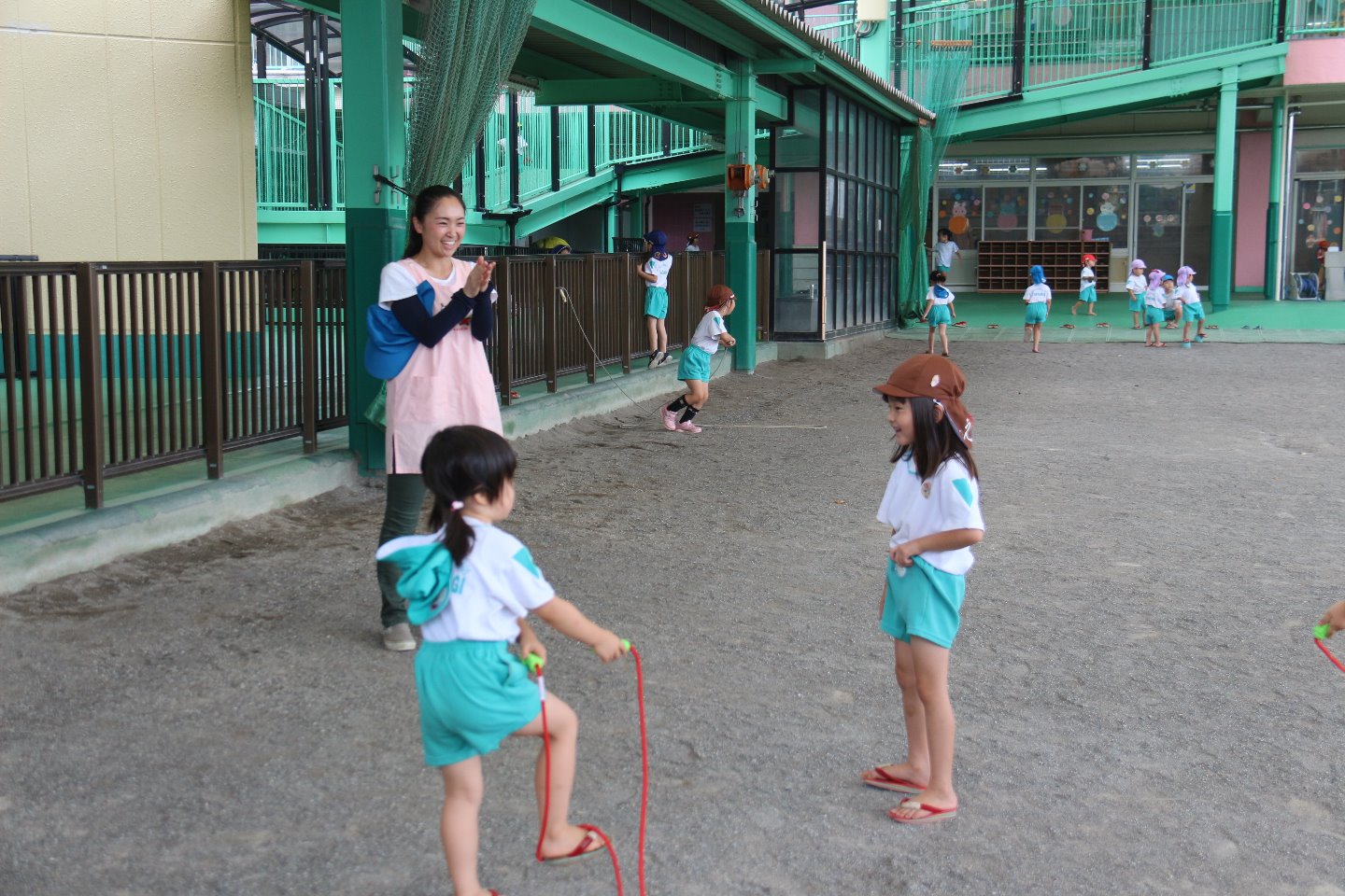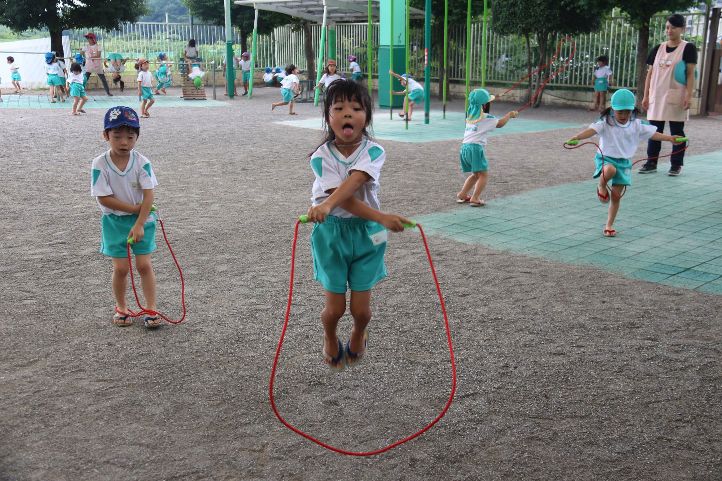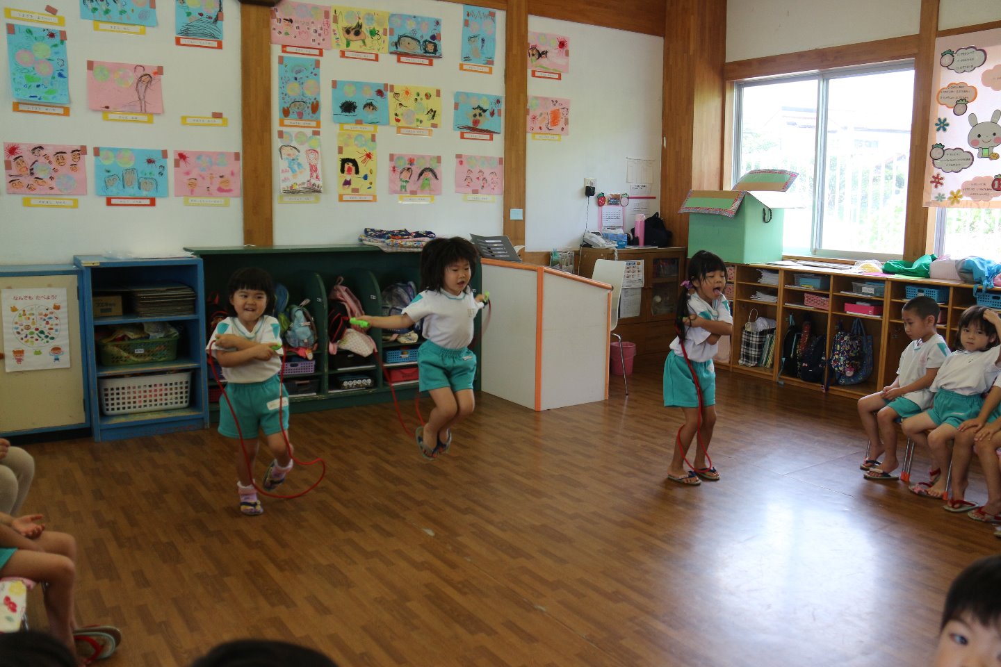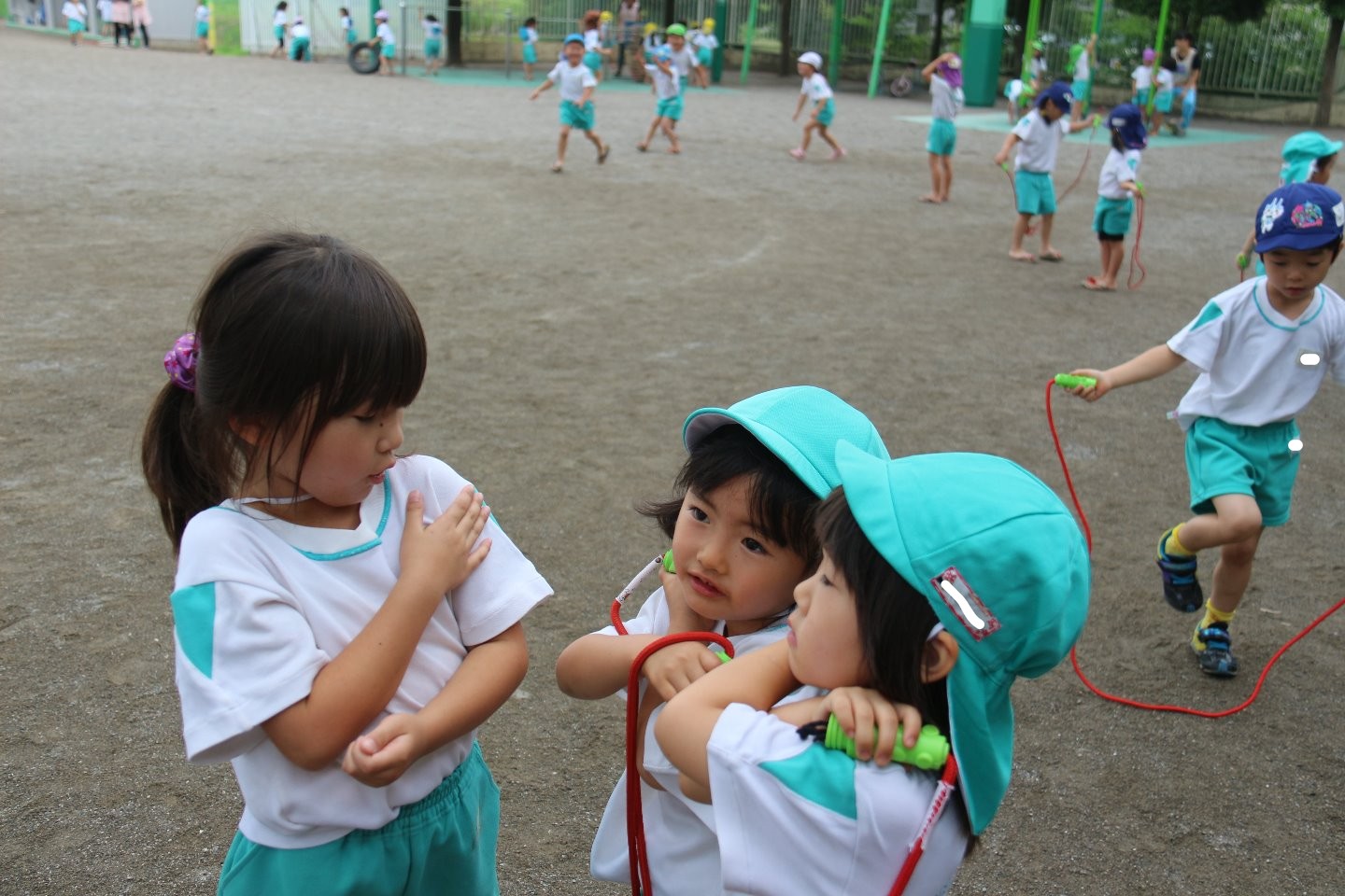 年中さんのお友達があや跳びの練習を始めました!「なかなか上手くいかないなぁ~」と困っているところへ年長さんのお姉さんがやって来て跳び方の説明をしてくれたのです!