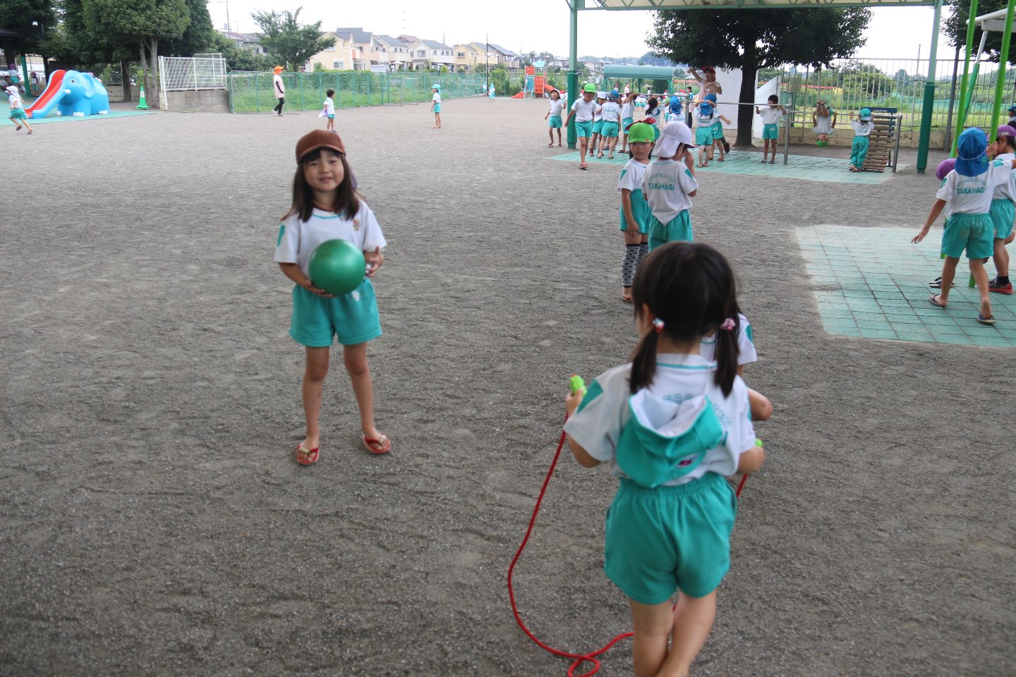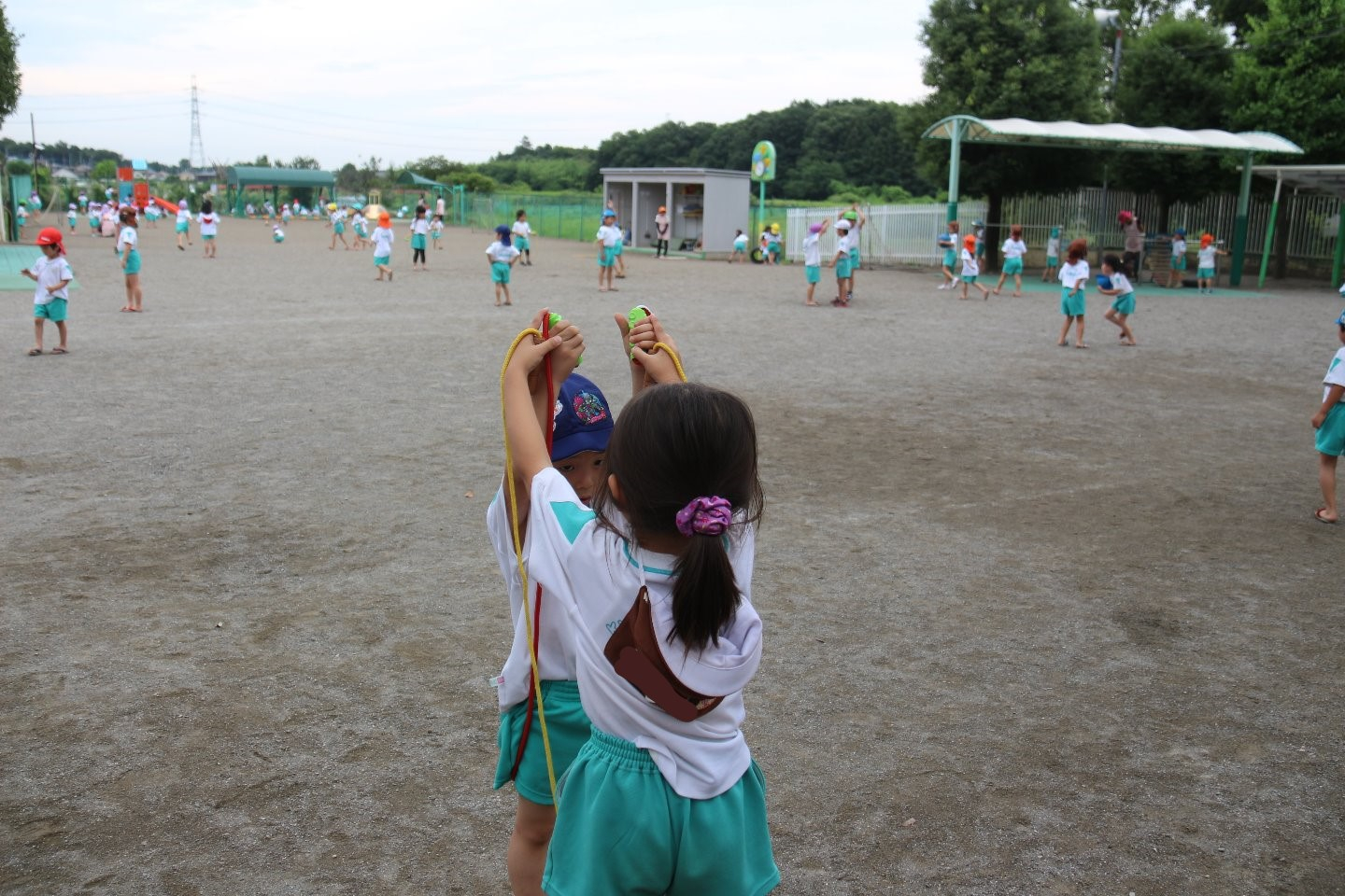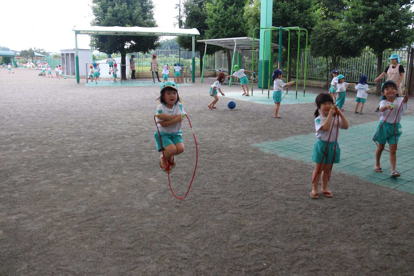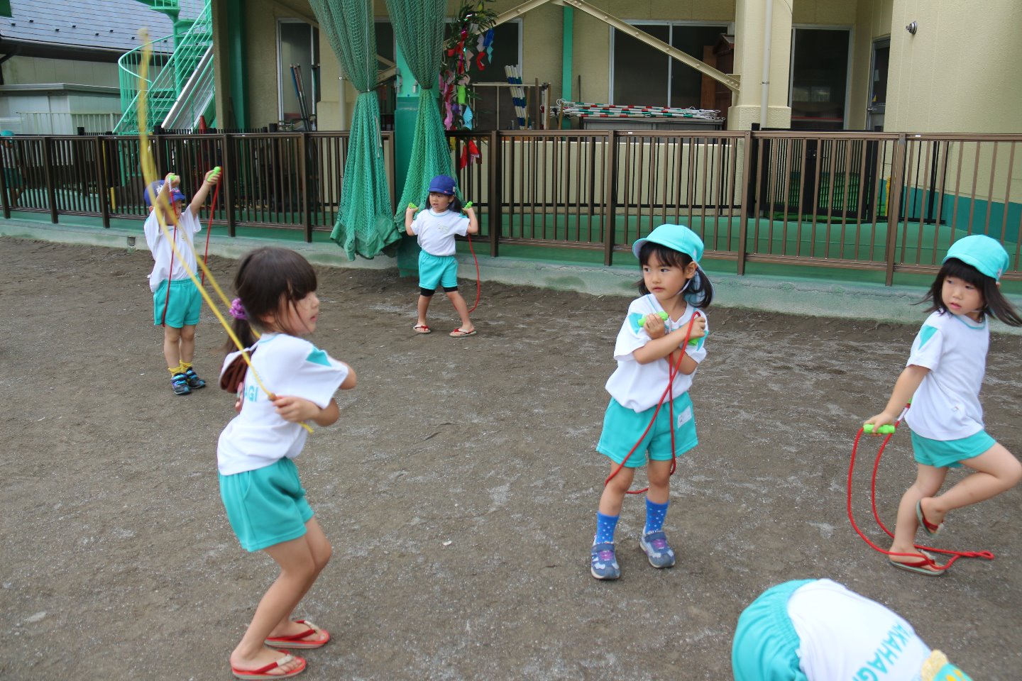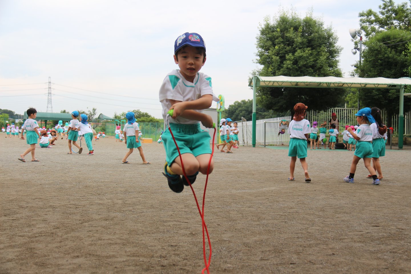 年中さんのお友達があや跳びの練習を始めました!「なかなか上手くいかないなぁ~」と困っているところへ年長さんのお姉さんがやって来て跳び方の説明をしてくれたのです!