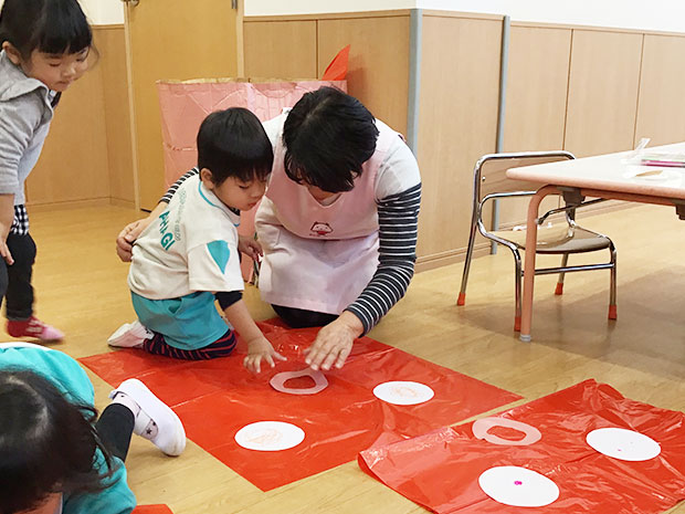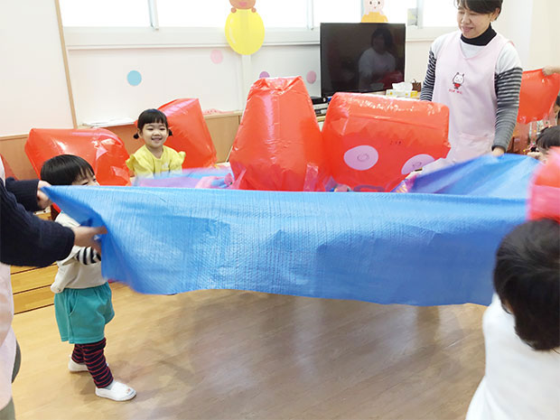 • そのタコさんを、みんなでビニールシートの海に泳がせました。